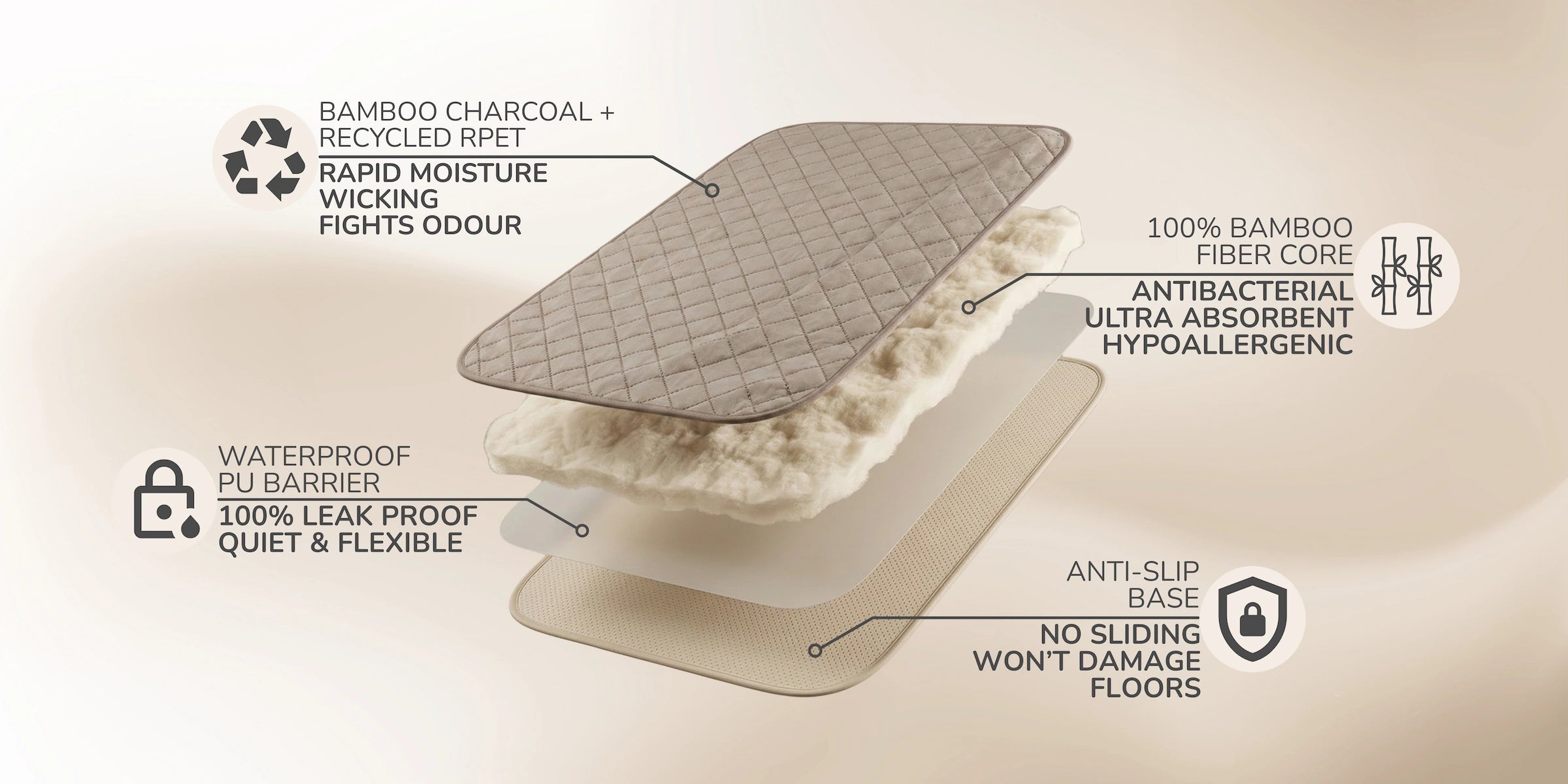 It’s easier than you think! Just rinse off any excess mess first, then machine wash cold with mild detergent — no bleach or fabric softener. For freshness, line-dry in the sun or tumble dry on low. The bamboo charcoal in the top layer helps naturally neutralise odour, so your machine (and your home) stay fresh.